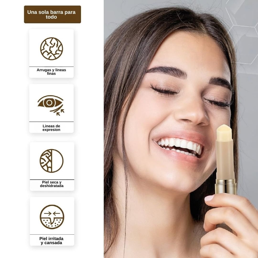 Formulado con Centella Asiática (Cica), reconocida por sus propiedades calmantes y regeneradoras, junto a un potente complejo de aminoácidos, ceramidas, ácido hialurónico, colágeno y elastina, este stick trabaja para hidratar, nutrir y reforzar la barrera cutánea, devolviendo firmeza y vitalidad a la piel.