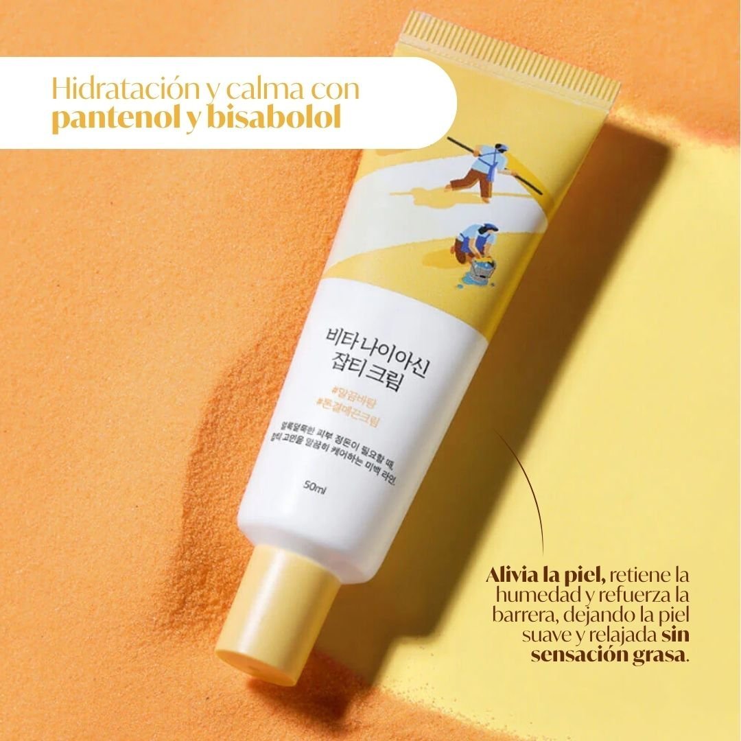 La Vita Niacinamide Dark Spot Cream de ROUND LAB es una crema facial iluminadora diseñada para reducir la hiperpigmentación, manchas y tono desigual. Con un 5% de niacinamida, combinada con ácido tranexámico, glutatión y vitamina C estabilizada, aporta un potente efecto despigmentante mientras refuerza la barrera cutánea.
